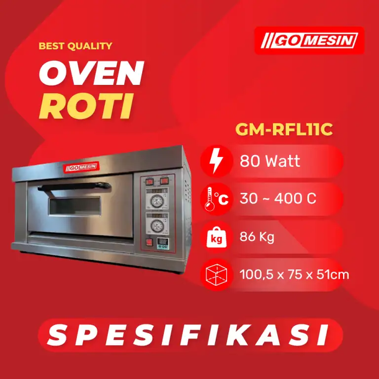 Oven Bakery GM-RFL11C adalah oven roti gas profesional yang dirancang sebagai oven bakery gas dengan sistem pemanggangan oven gas 1 deck 1 tray untuk kebutuhan usaha kecil hingga menengah. Oven ini menggunakan perapian atas dan bawah yang menghasilkan panas merata sehingga cocok untuk memanggang roti, pastry, dan aneka kue dengan hasil konsisten.