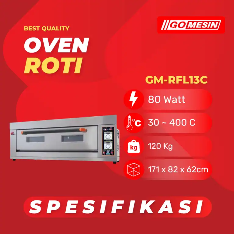 Jika Anda mencari oven bakery termurah dengan kualitas terbaik, maka pilihan paling tepat adalah GM-RFL13C Gomesin. Dengan kapasitas besar, fitur lengkap, material kokoh, dan harga terjangkau, oven ini dirancang untuk mendukung kesuksesan bisnis bakery Anda.
