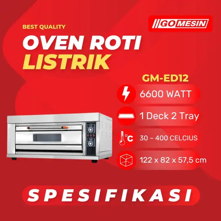 Salah satu pilihan terbaik saat ini adalah Oven Listrik Kualitas Terbaik GM-ED12 Gomesin. Oven ini hadir dengan desain modern, fitur lengkap, serta performa handal untuk memenuhi kebutuhan produksi roti, kue, maupun pastry dalam skala menengah hingga besar. Dengan kapasitas 1 deck 2 tray, oven ini sangat ideal bagi usaha yang mengutamakan efisiensi dan hasil yang konsisten.