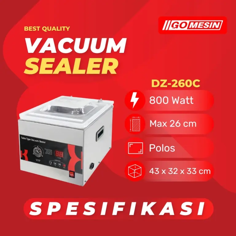 Vacuum Sealer Murah DZ-260C Gomesin hadir sebagai solusi praktis dengan performa optimal, konsumsi listrik efisien, serta harga yang tetap terjangkau. Mesin ini dirancang untuk memenuhi kebutuhan pengemasan modern secara aman dan konsisten.